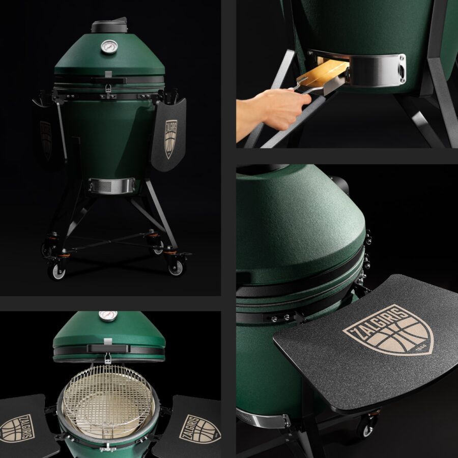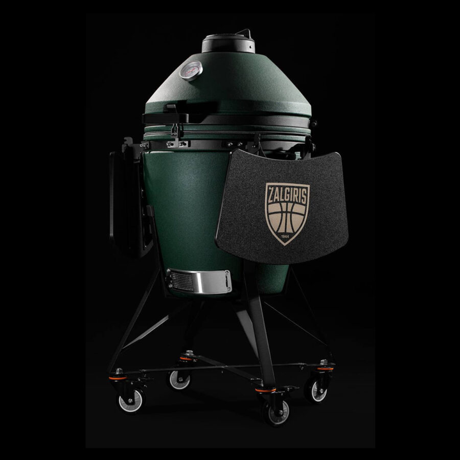 Keraamiline grill ratastel alusega ja Žalgiris logoga küljelauad
